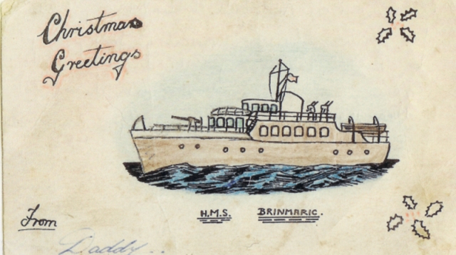 Chief Petty Officer of the Brinmaric Christmas Card drawn by A. Thompson sent to his family who were living in Bolton Lancashire, after their evacuation from Jersey.
